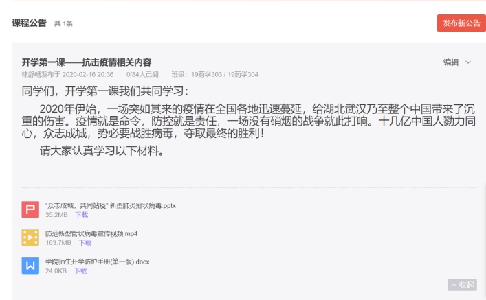 值得一提的是,在“网络开学第一课”中,教师们把疫情防控融入到了教学中,在教学案例中把共产党员冲锋在前,医务人员日夜奋战,科研人员全力攻关,众多劳动者坚守岗位、默默付出,无数企业和个人慷慨解囊、捐赠捐助等一系列案例与学生分享,从防疫抗疫中挖掘教育素材,引导学生积极投入到相关领域的思考、总结和实践,对学生成长成才,树立正确的价值观、人生观和世界观都有着重大的意义。