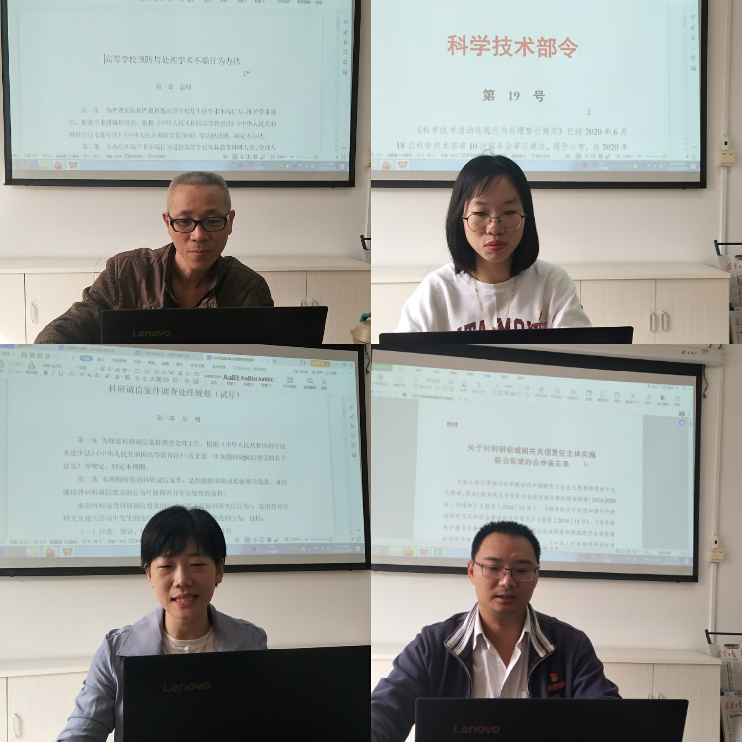 概论教研室主任胡济林、基础教研室主任颜冰凤、形势与政策教研室主任郑冰和就业指导与军事理论教研室张崇飞分别带领全体教师开展各项文件的学习讨论,内容包含《高等学校预防与处理学术不端行为办法》《科学技术活动违规行为处理暂行规定》《关于对科研领域相关失信责任主体实施联合惩戒的合作备忘录》《科研诚信案件调查处理规则》。