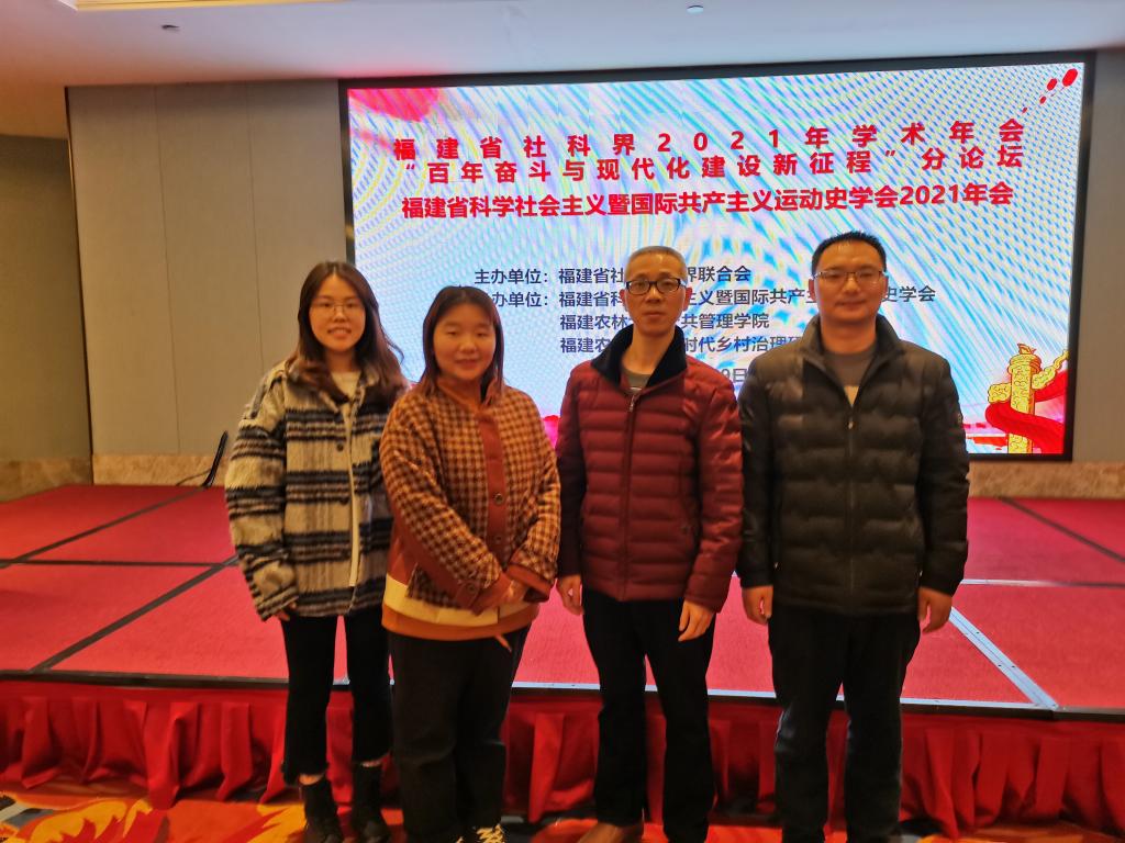 2021年12月18日至19日,由福建省社会科学界联合会主办,福建省科学社会主义暨国际共产主义运动史学会、福建农林大学公共管理学院、福建省社科研究基地新时代乡村治理研究中心联合承办的2021年福建省社科界学术年会“百年奋斗与现代化建设新征程”分论坛暨福建省科学社会主义暨国际共产主义运动史学会2021年年会在福州召开。我校马克思主义学院教师胡济林、张崇飞、林美辰、朱丽燊等4位出席年会。
