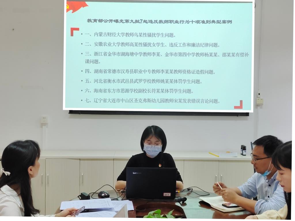 会上,罗芸老师通报了教育部公开曝光第九批7起违反教师职业行为十项准则典型案例,强调学院教师要深刻认识自己肩负的职责和使命,牢记为党育人、为国育才初心,自重自省,坚守师德底线。