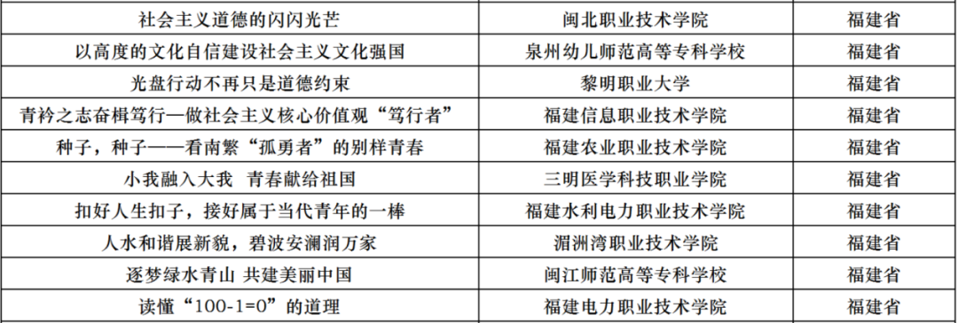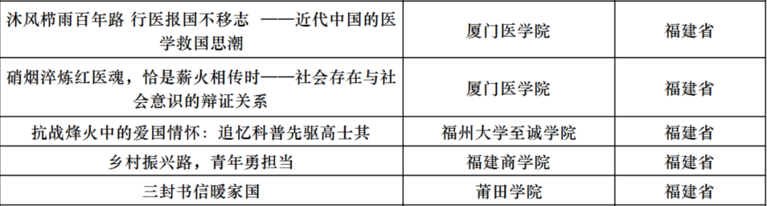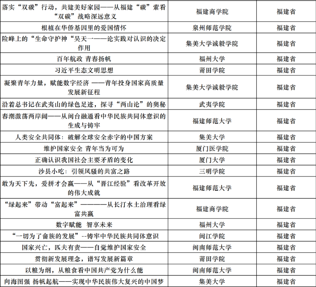 近日,由教育部高校思政课教学指导委员会主办的第六届全国高校大学生讲思政课公开课展示活动评选结果公布,全国共评选出560件获奖作品,福建高校43件作品获奖。获奖名单如下: