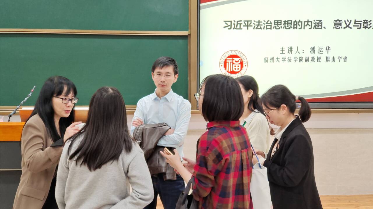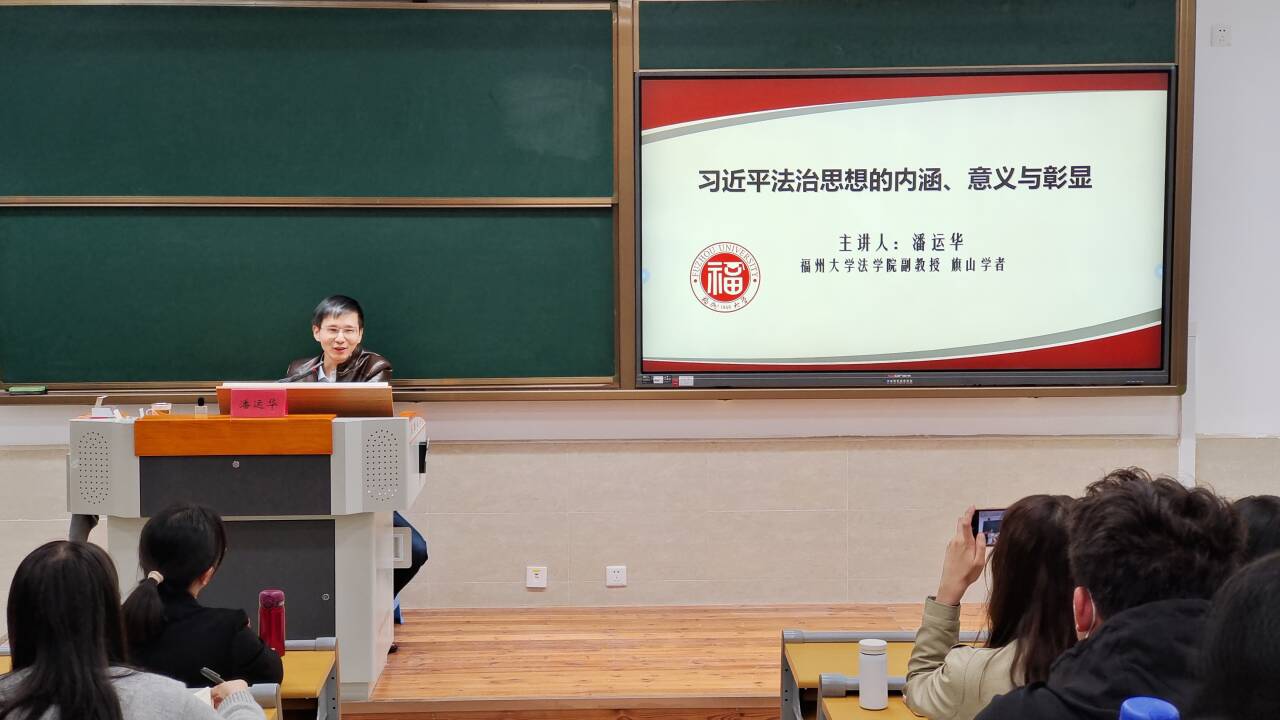 习近平法治思想是马克思主义法治理论中国化的最新成果,是中国特色社会主义法治理论的重大创新发展,对于全面加快我国社会主义法治建设具有重大现实意义和深远历史意义。在第十个国家宪法日即将到来之际,为引导广大师生大力弘扬宪法精神,建设社会主义法治文化,深刻认识我国社会主义法治的本质特征,深刻认同党的领导是全面依法治国的根本保证,2023年11月23日,福建省民商法学研究会理事,福州大学“旗山学者”、法学院副教授潘运华受邀在崇健楼202开展专题讲座、教学研讨和法律咨询“三组合”活动。我校思政课专兼职教师、医学技术与工程学院部分学生参加讲座,讲座由马克思主义学院院长熊美兰、副院长来朋珍共同主持。