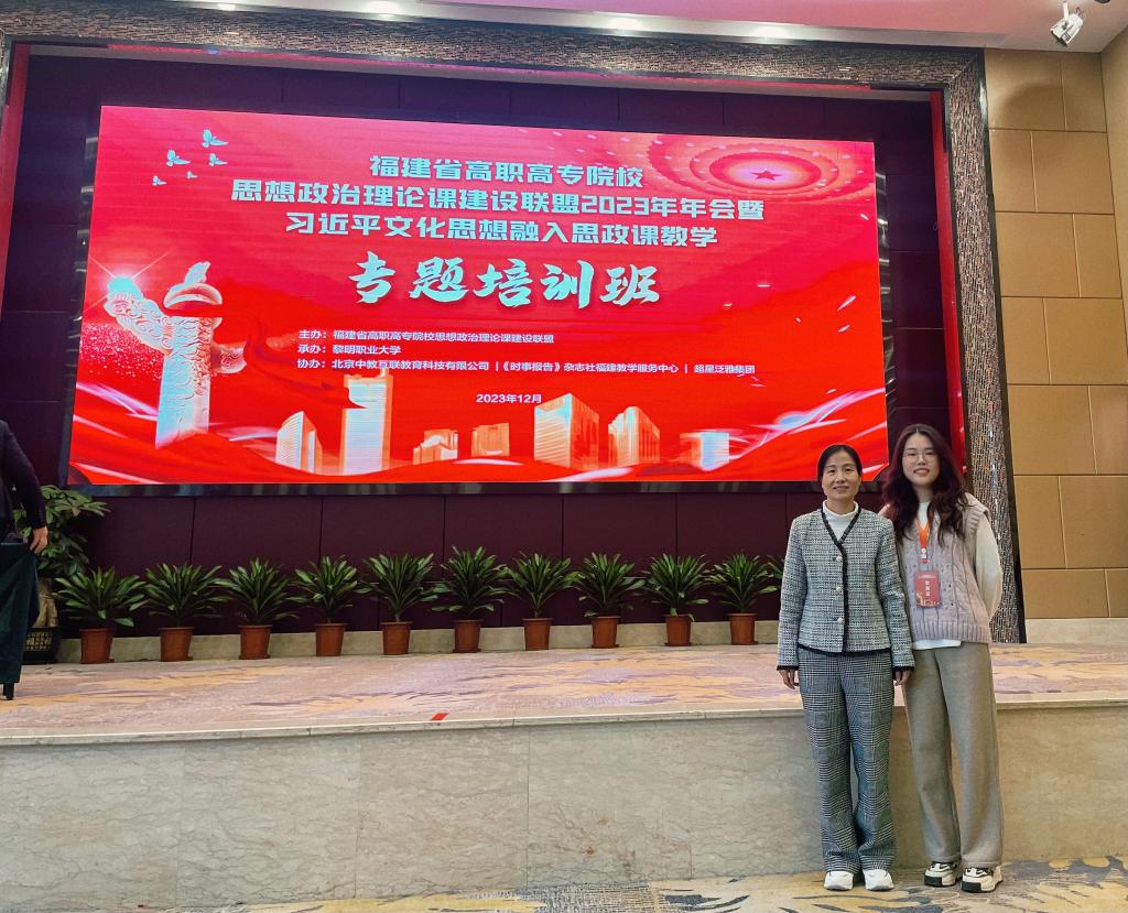 为深入开展学习贯彻习近平新时代中国特色社会主义思想主题教育,贯彻落实习近平总书记在中央政治局第五次集体学习时的重要讲话精神,坚持不懈用习近平新时代中国特色社会主义思想铸魂育人,推动习近平文化思想融入思政课教学,12月7日-10日,由福建省高职高专院校思想政治理论课建设联盟主办,黎明职业大学承办的福建省高职高专院校思想政治理论课建设联盟2023年年会暨习近平文化思想融入思政课教学培训班在泉州召开。我院马院副院长来朋珍、专任教师朱丽燊前往参加。