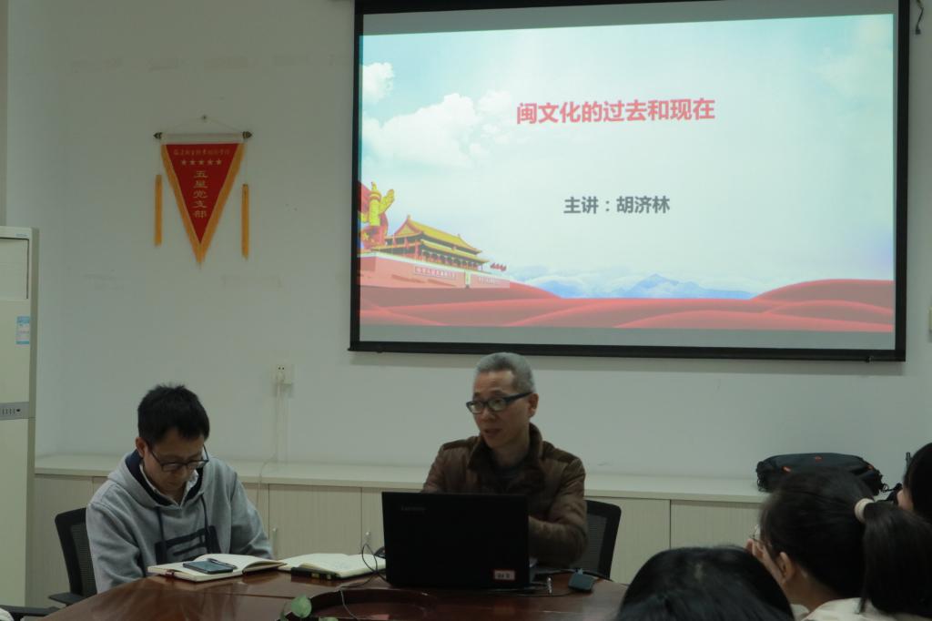 胡济林首先简要介绍了福建的历史和基本概况,接着从闽文化的形成和发展、闽文化的特点、闽文化的精神内核、闽文化的影响力等多方面作了讲解。他指出,闽文化是“多元一体”中华文明中的一颗“耀眼星辰”,了解闽文化的过去和现在对大学生担负起新的文化使命,坚定“四个自信”具有重要意义。