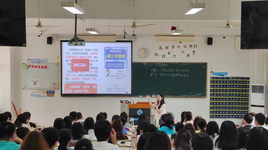 邹亚彤老师的授课内容是“思想道德与法治”课程中的“社会主义法律的特征与运行”专题。邹亚彤以“帮信罪”进行案例导入,开拓学生法治思维,激发学生学习兴趣。随后,围绕“法律的起源、法律的含义、法律的发展”三个部分展开教学,通过视频播放、理论讲授、师生互动等教学手段,突出重点,突破难点。评课中,同行教师们纷纷对邹亚彤洪亮的声音、良好的教态与教学氛围的营造予以肯定,同时也提出一些建议:适当降低话筒声音,适当放慢语速,留给学生信息接收和思考的时间;优化教学节奏,简化案例导入;探寻更有效的互动方式,调动后排同学的积极性等。