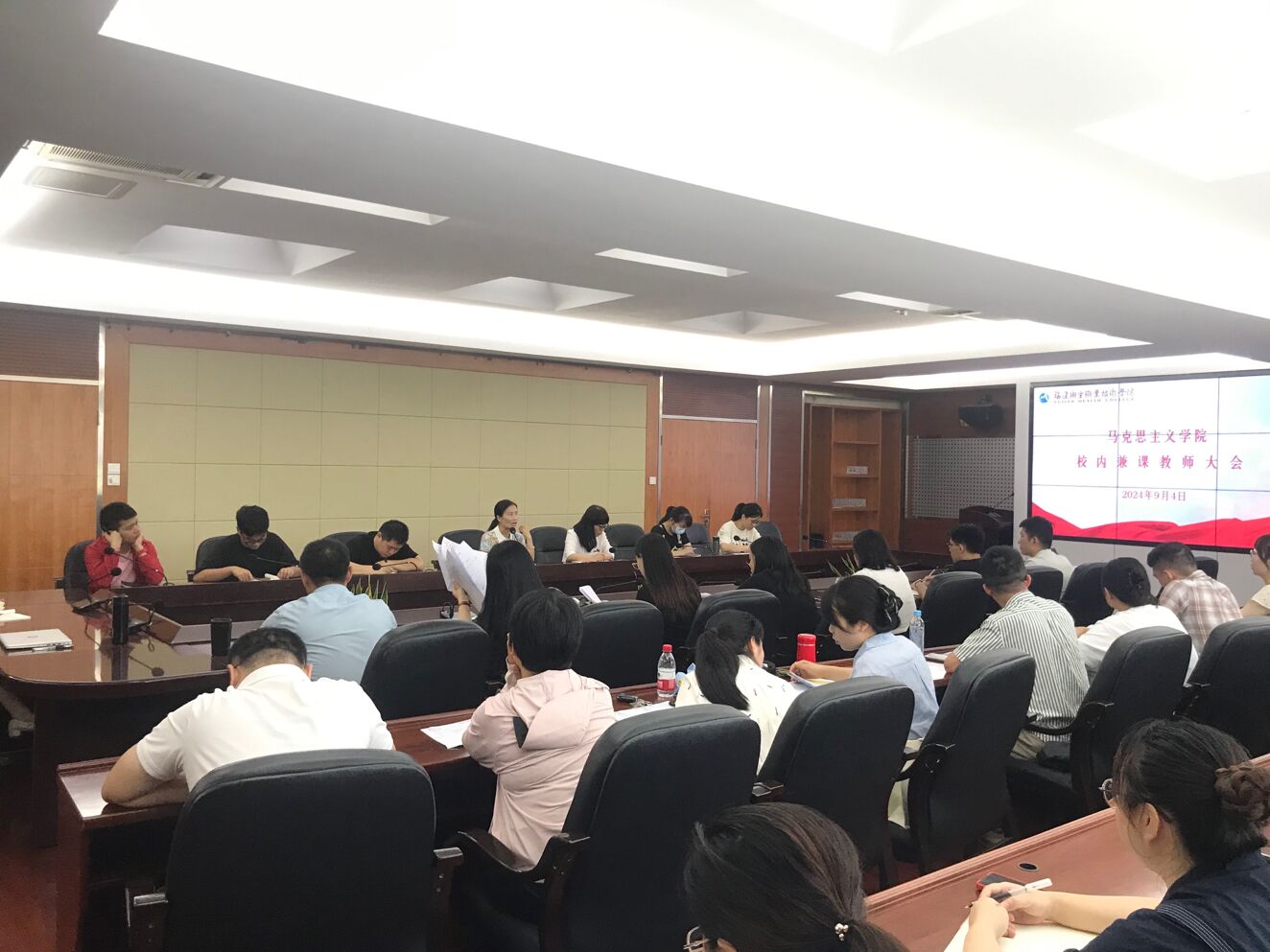 为进一步加强兼职兼课教师的管理,提高人才培养质量,促进学院教学质量的整体提升,2024年9月4日,马克思主义学院在厚德楼四楼会议室召开2024-2025学年第一学期校内兼职兼课教师教学工作会议。马克思主义学院院长熊美兰、副院长来朋珍、教研室主任以及本学期担任教学任务的校内兼职兼课教师等近40人参加了会议,会议由来朋珍主持。