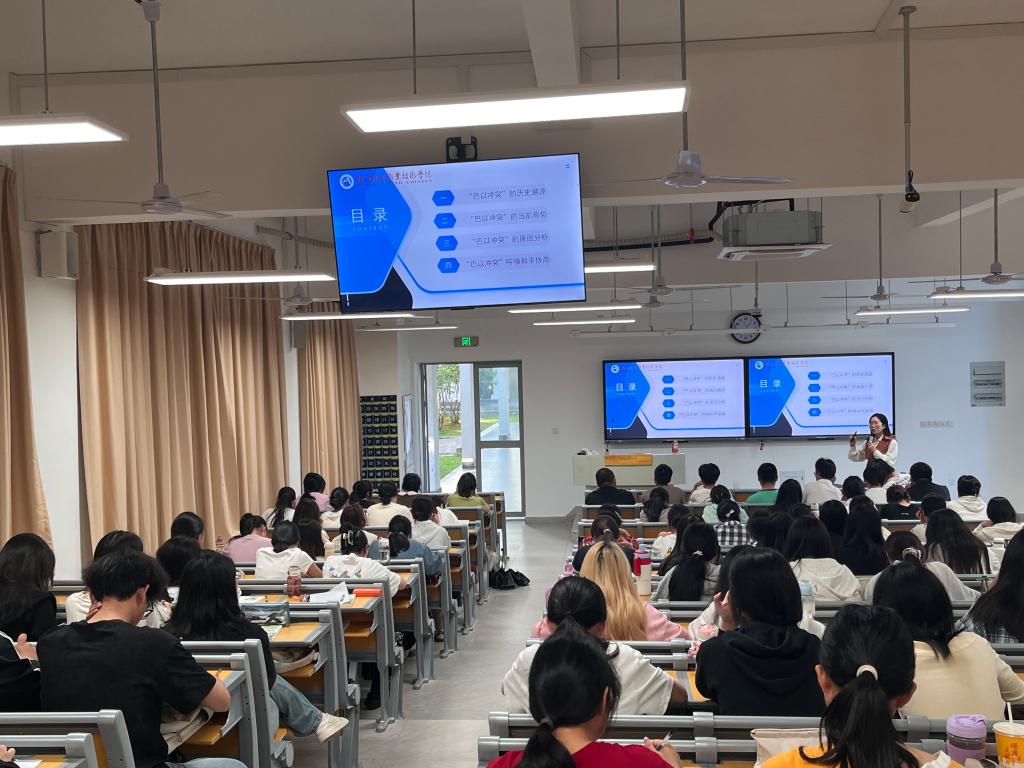 杨盈老师首先用“我在巴勒斯坦长不大”的一个外媒对巴勒斯坦儿童未来理想的采访视频作为讲座的导入点,分别从巴以冲突的历史溯源、当前局势、原因分析及其呼唤和平协商四个方面展开。整个讲座中,杨盈老师通过理论讲授、案例分析、思考互动、交流观点、分享感悟等多种方式,深入浅出,环环相扣地讲述着讲座内容,现场氛围轻松活跃,同学们积极参与互动与发表学习感悟。