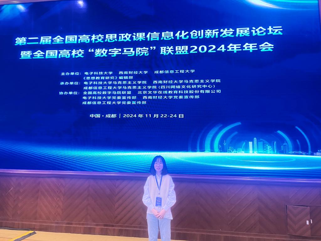 11月23日至24日,第二届全国高校思政课信息化创新发展论坛暨全国高校“数字马院”联盟2024年年会举行。该年会由电子科技大学、西南财经大学、成都信息工程大学、《思想教育研究》编辑部联合举办。来自全国200余所高校,共计400余名思政课专家、学者、教育科技工作者参会,围绕“高校思政课信息化创新发展”主题,聚焦数智时代演化与变革、共议学科融合与发展。我校马克思主义学院思想道德与法治教研室主任颜冰凤参加了会议。