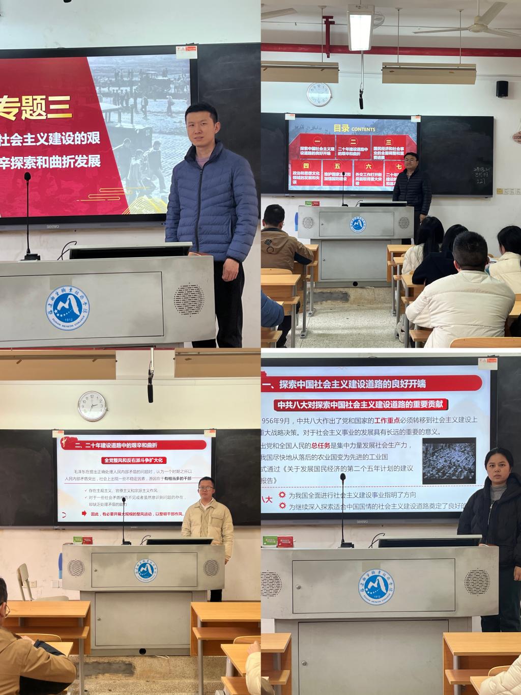 为切实提高思政课教学质量,增进教学交流,2025年2月27日,马克思主义学院思想道德与法治教研室在教学楼108开展对兼课教师试讲集中听课活动,试讲内容为“新中国史”课程专题三“社会主义建设的艰辛探索和曲折发展”。活动由思想道德与法治教研室主任颜冰凤主持,思想道德与法治教研室全体专职教师参加。