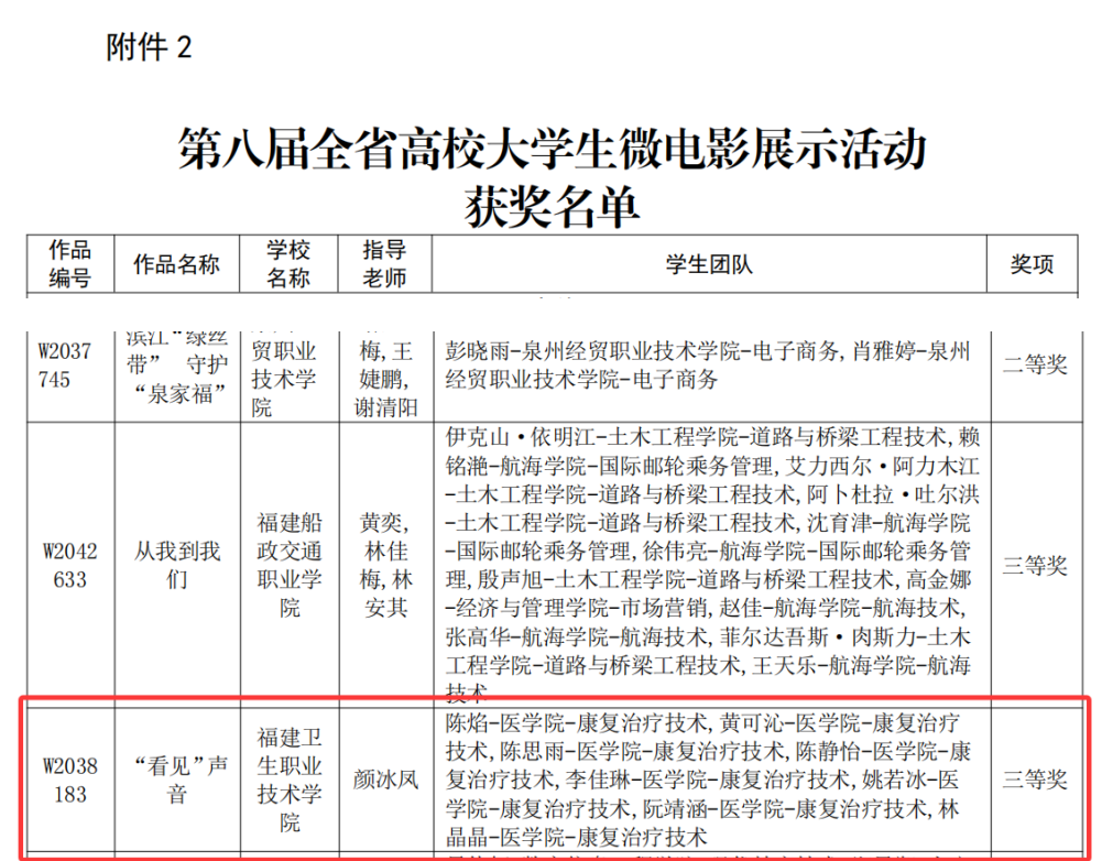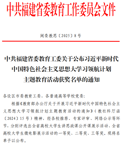 日前,由中共福建省委教育工作委员会主办的习近平新时代中国特色社会主义思想大学习领航计划系列主题活动获奖名单揭晓,我校学生陈焰、黄可沁、陈思雨、陈静怡、李佳琳、姚若冰、阮靖涵、林晶晶的微电影作品《“看见”声音》获得第八届全省高校大学生微电影展示活动三等奖,指导老师为颜冰凤。