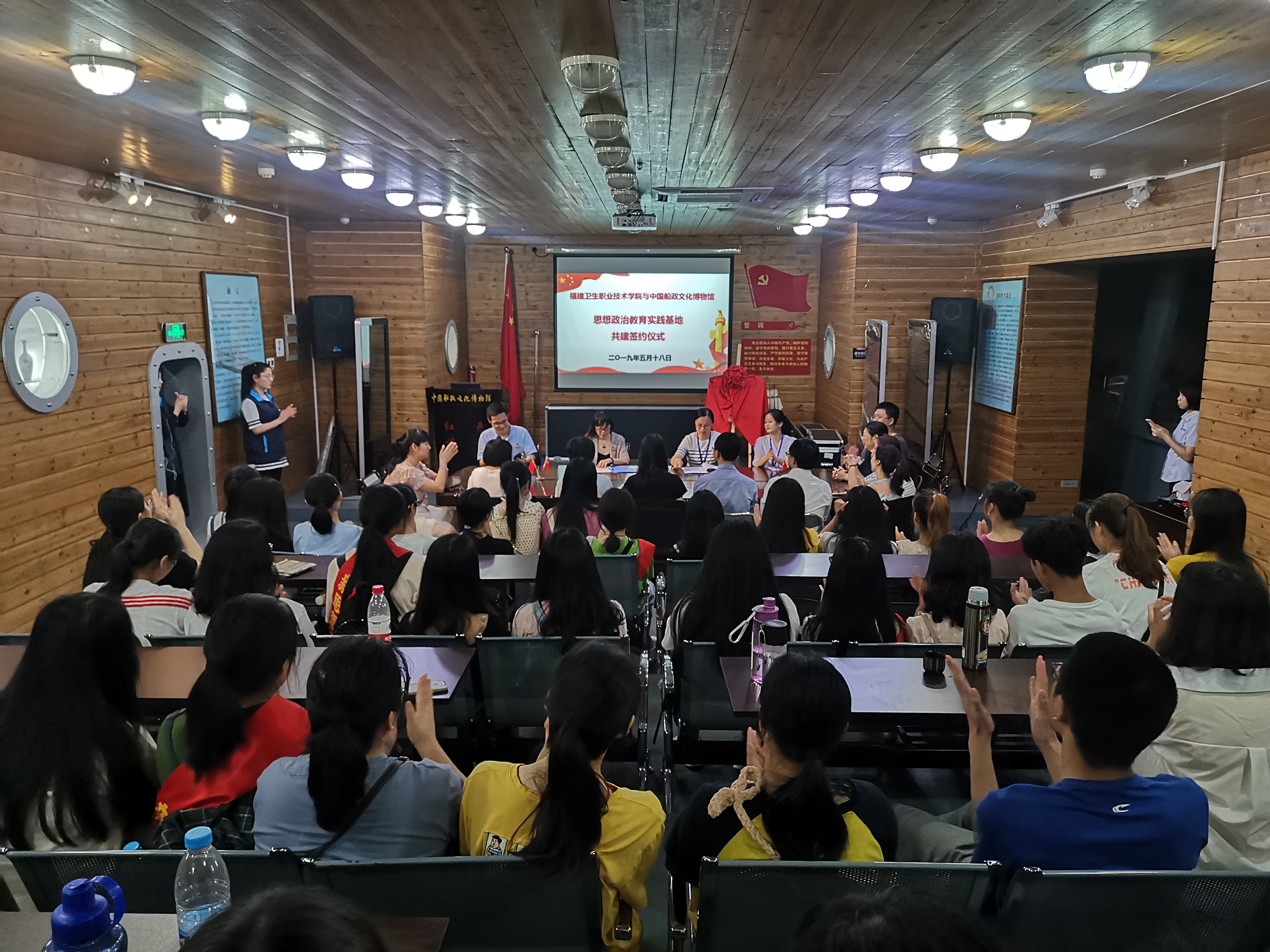 为纪念五四运动100周年和新中国成立70周年,福建卫生职业技术学院习近平新时代中国特色社会主义思想读书社(简称读书社),于2019年5月18日在中国船政文化博物馆参加福建卫生职业技术学院与中国船政文化博物馆共建思想政治教育实践基地签约仪式。出席本次签约仪式的有福建卫生职业技术学院马克思主义学院名誉院长魏立娜、马克思主义学院院长熊美兰、马克思主义学院副院长黄曦以及马院全体教师,中国船政文化博物馆副馆长王芳以及习近平新时代中国特色社会主义思想读书社全体成员。