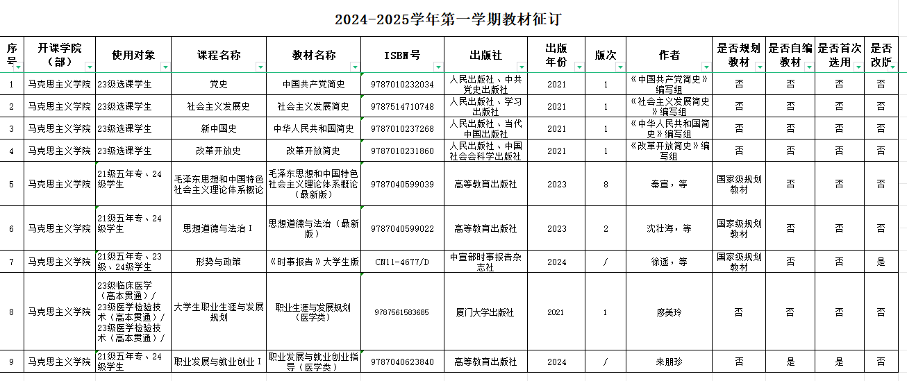 根据教务处下发的教材选用通知,经各课程负责人、教研室主任初审,马克思主义学院教材建设小组审核,拟定2024-2025学年第一学期教材选用情况如下: