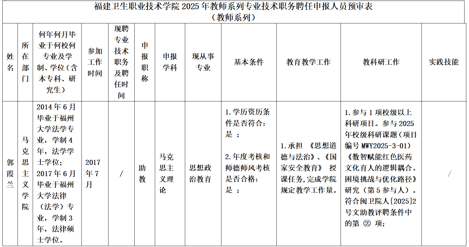 根据《福建卫生职业技术学院关于印发专业技术职务评审实施方案的通知》(闽卫院人〔2025〕2号)和《关于开展2025年度初级专业技术职务评聘工作的通知》要求,经个人申报,马院初审,现有1位申报人申请相应专业技术职务聘任。申报人员具体情况如下: