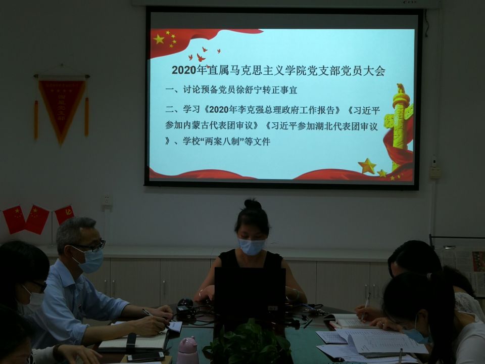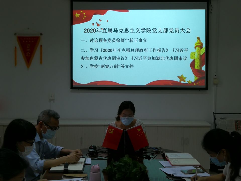 2020年6月4日,直属马克思主义学院召开党支部党员大会,会议由马克思主义学院熊美兰书记主持。本次党员大会包括:讨论徐舒宁同志预备党员转正事宜、党员政治学习。