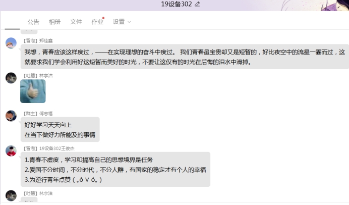 对于如何度过青春,同学们纷纷表示:“爱国不分时间,不分时代,不分人群,有国家的稳定才有个人的幸福,青春不虚度,学习和提高自己的思想境界是任务。”“我想,青春应该这样度过,——在实现理想的奋斗中度过。 我们青春虽宝贵却又是短暂的,好比夜空中的流星一霎而过,这就要求我们学会利用好这短暂而美好的时光,不要让这仅有的时光在后悔的泪水中滑掉。”