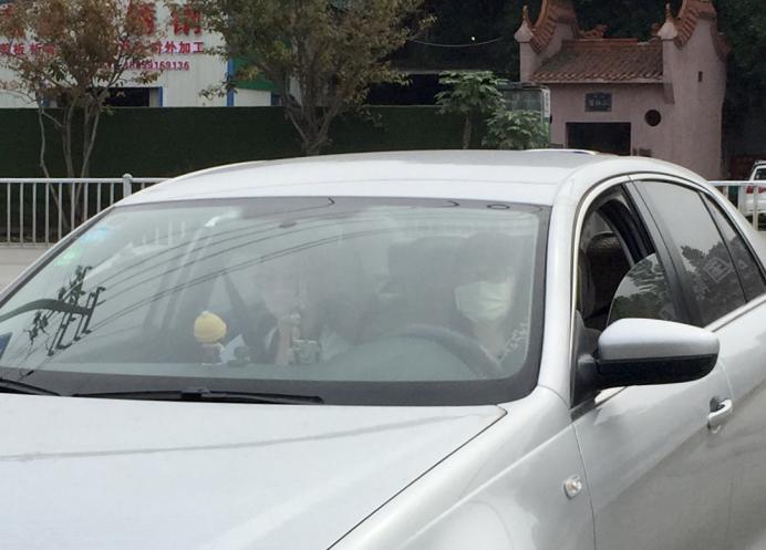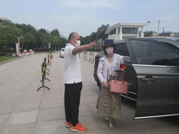 马克思主义学院院长熊美兰扮演学生家长,自驾驱车带领扮演学生的颜冰凤老师来到学校,到校门口后,学生家长就此离开校园。