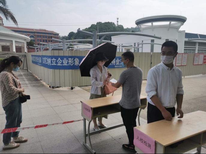 考生接受工作人员核验身份、检查“闽政通”健康码、测量体温。