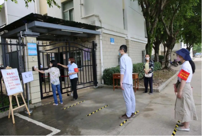 生下车按照地标保持1米的距离排队,接受工作人员核验身份、检查“闽政通”健康码、测量体温。经测量体温检查正常后,学生按照地标保持1米的距离排队有序步行至校内。