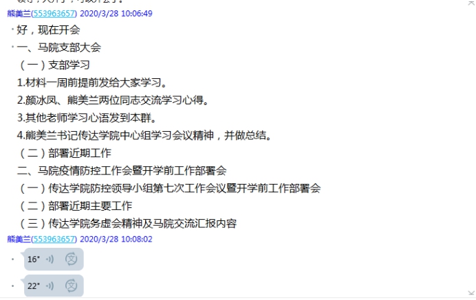 2020年3月28日上午,直属马克思主义学院党支部召开线上党员大会,集中学习《新时代高等学校思想政治理论课教师队伍建设规定》《教育部有关部门负责人就<新时代高等学校思想政治理论课教师队伍建设规定>答问》等6份文件。会议由党支部书记熊美兰主持,全体教师党员参加了会议。教师们在会议上畅谈心得和感想,掀起学习讨论热潮。