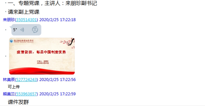 为更好地做好疫情防控工作,发挥马院的示范引领作用,2020年2月25日下午,直属马克思主义学院党支部利用QQ群网络平台召开了一场疫情防控的专题党课学习会。该次党课学习会由支部书记熊美兰主持,支部副书记来朋珍主讲。直属马克思主义学院党支部全体教师党员参加了学习。