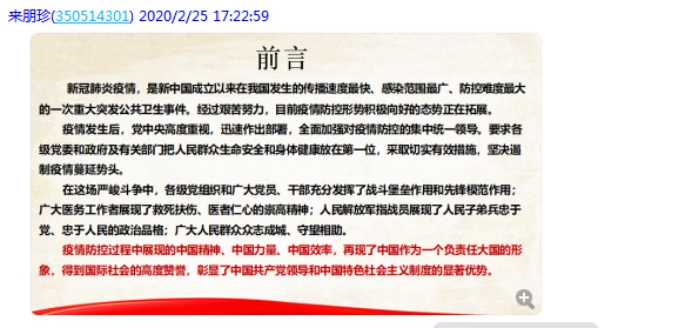颜冰凤老师:瘟疫无情人有情,作为思政课教师,在这个特殊的窗口期,挖掘有助于提升学生爱国主义情怀、民族精神、社会责任感的典型案例,讲好有温度的思想政治理论课,引导学生树立打赢疫情防控战的信念和信心,是每位马院教师也是每位党员义不容辞的责任。
