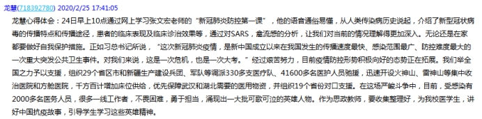 龙慧老师表示,24日上午10点通过网上学习张文宏和吴凡两位老师的“新冠肺炎防控第一课”,让我们对当前肺炎疫情的情况理解得更加深入,对我们做好自我保护措施有很大的帮助作用,作为思政课教师,要收集整理好抗击疫情典型案例,为我校医学生讲好中国抗疫故事,引导学生学习这些英雄精神。