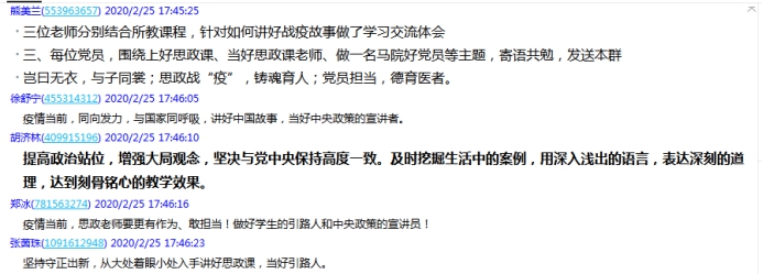 张天文老师:通过学习习近平总书记讲话和昨天张文宏、吴凡专家讲座,今天下午又学习了各位老师的发言,收获很大,我将继续深入学习,促进、提高,做好一名党员和思政教师应有的职责。引领学生树立打赢疫情防控战的信念和信心,我们责无旁贷!