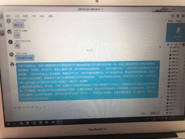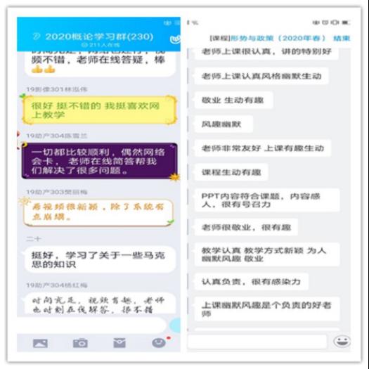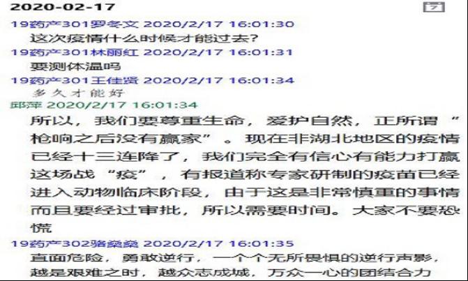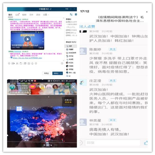 电脑这头,教师们摩拳擦掌,远程的另一端,学生们的反应如何呢?《形势与政策课》《毛泽东思想和中国特色社会主义理论体系概论》《军事理论》《就业指导》等课堂上,学生认真地观看抗击疫情短视频《同时间赛跑》等宣传视频和典型事例,兴致勃勃地完成科普知识小测验,积极地参与热烈地研讨。同学们纷纷表示:这堂“1+1”网络思政防控课图文并茂,既有权威解析,也有大众互动,老师也能及时在线解答。课程生动有趣,喜欢这种网上教学方式,并感谢老师们用心备课教学付出的辛劳。