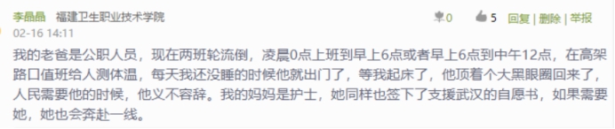 榜样不仅在远方,也在我们身边。这次疫情,或许我们才发现我们的父母不仅属于我们的,他们更是属于人民的,更是属于国家的。除了我们的父母,还有我们的学长学姐。