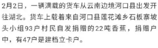 赠350吨“寿光蔬菜”后,山东再捐2000余吨蔬菜水果。河南一个国家级贫困县的村子为武汉捐了十万斤大葱。因为仓促联系不到机械,300多个村民到地里用手硬拔了三天。他们是来自河南洛阳嵩县闫庄镇竹园沟村!云南红河哈尼族彝族自治州河口县莲花滩乡石板寨向武汉捐了22吨香蕉。摘完香蕉后,用摩托车队运送下山,交给司机们接力运送,其中一个司机开了1800公里。他说:父亲曾经在武汉服役。
