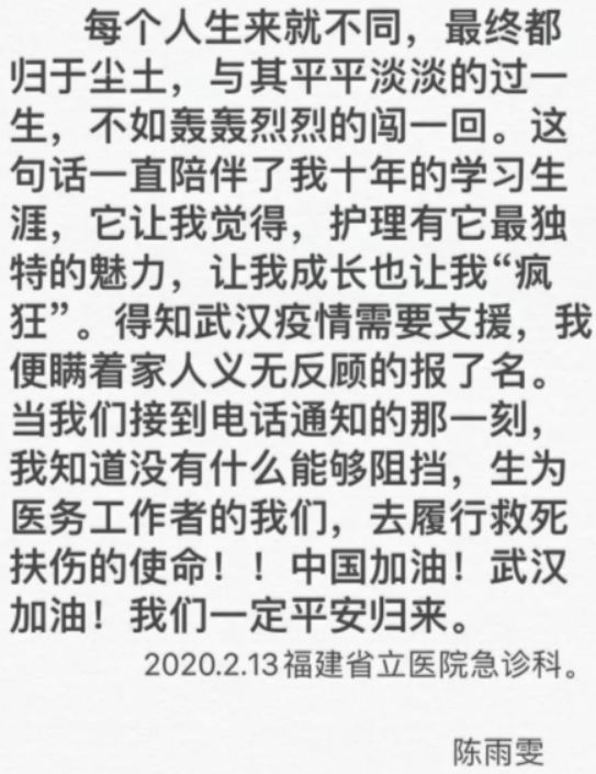在出发的时候,她写到:“每个人生来就不同,最终都归于尘土,与其平平淡淡的过一生,不如轰轰烈烈的闯一回。这句话一直陪伴我十年的学习生涯,它让我觉得,护理有它最独特的魅力,让我成长也让我“疯狂”。得知武汉疫情需要支援,我便瞒着家人义无反顾的报了名,当我们接到电话通知的那一刻,我知道没有什么能够阻挡,生为医务工作者的我们,去履行救死扶伤的使命!中国加油!武汉加油!我们一定平安归来。”这不是豪言壮语,而是作为一名护理人员发出的心声,她仅想用自己所学到的知识多就一些人。