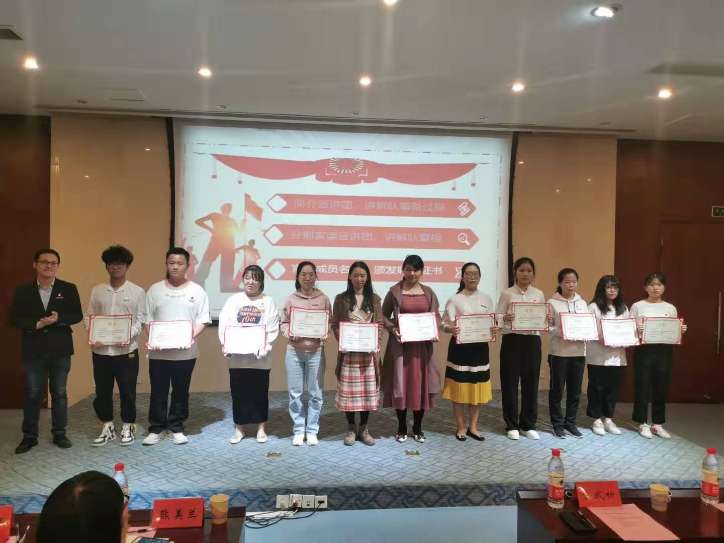 会议伊始,读书社社长雷榕芳同学向大家汇报了讲解队的筹备过程,中国船政文化博物馆、林则徐纪念馆、马江海战纪念馆为我校校外思政教育实践基地,依托三馆分别成立了三支讲解队;随后三馆讲解队大队长林灵同学为大家宣读了三馆讲解队的章程,详细介绍了讲解队的基本制度、组织制度、会议制度、学习制度、考勤制度及奖惩制度。随后,团委书记黄曦老师分别为三馆讲解队的成员颁发了聘任证书。
