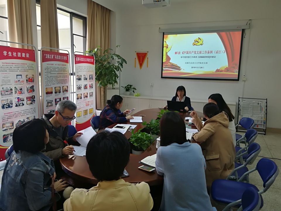 为使广大党员深入领会《中国共产党支部工作条例(试行)》(后简称《条例》)精神,全面掌握《条例》内容,增强贯彻执行《条例》的思想自觉和行动自觉,2019年3月28日,直属马克思主义学院党支部书记熊美兰为支部全体党员上党课,宣传解读《条例》,支部全体党员参加了这次学习。