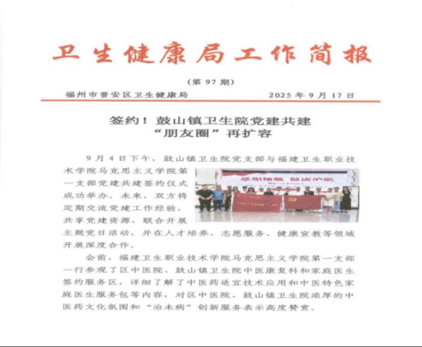 2025年9月4日,马克思主义学院第一党支部与晋安区鼓山镇卫生院党支部成功“结对”,举行党建共建签约仪式,点燃了校地协同、资源共享的“第一簇星火”。双方将以共建为契机,建立定期交流机制,共享党建与业务资源,联合开展主题党日活动,并重点围绕医德医风教育、人才培养、志愿服务等领域深化合作。签约前,支部党员实地探访了晋安区中医院及鼓山镇卫生院的中医康复科、家庭医生签约服务区,深切感受基层医疗机构的创新实践与浓厚的中医药文化氛围。此次共建,是“星火”品牌向外延伸、助力基层卫生健康服务高质量发展的关键一步。
