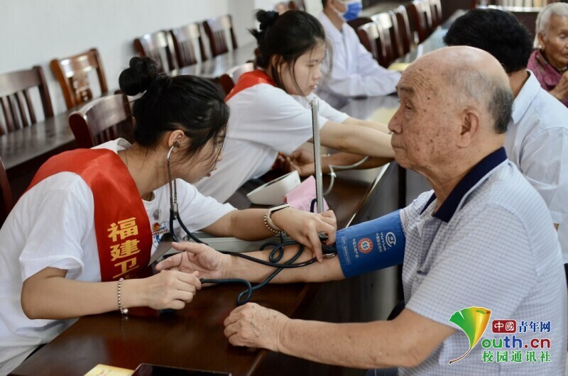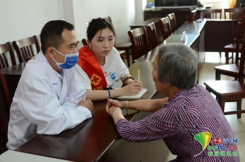 图为“马上逐梦”队队员为村民测量血压。中国青年网通讯员 赵靖宇 摄