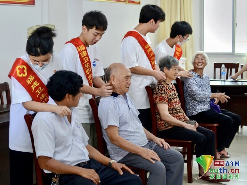 图为“马上逐梦”队队员们为村民推拿按摩。中国青年网通讯员 赵靖宇 摄
