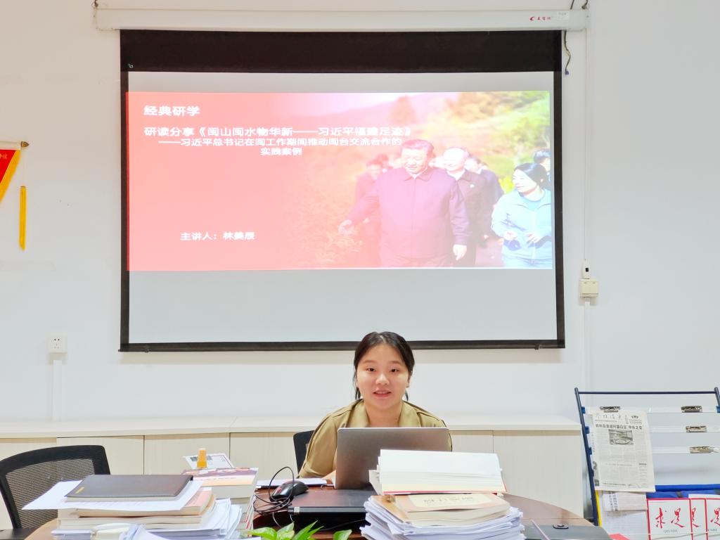 活动中,林美辰从《闽山闽水物华新——习近平福建足迹》中关于习近平总书记在闽工作期间推动闽台交流合作的实践案例进行研学分享,指出学习习近平总书记在闽工作期间推动闽台交流合作的实践案例有助于我们深入学习贯彻党的二十大精神和新时代党解决台湾问题的总体方略,具有重要的理论意义和时代意义。