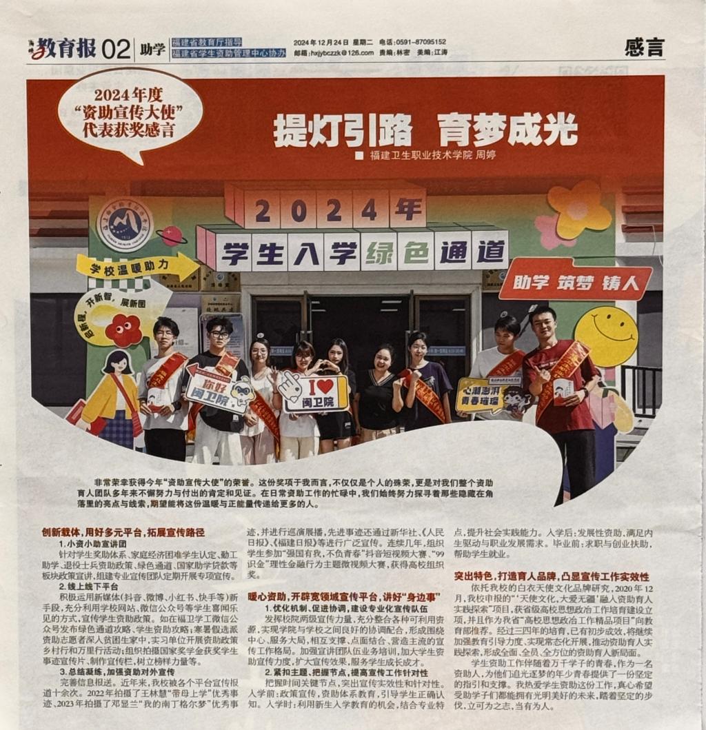 学生工作部周婷以“资助宣传大使”的身份,在海峡教育报分享《提灯引路,育梦成光》工作感言。