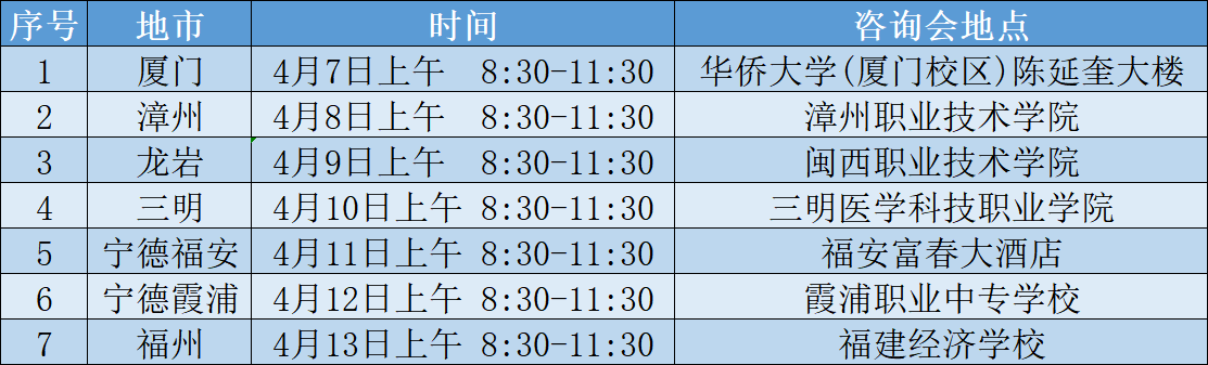 2025年福建省高职分类志愿填报即将到来,为帮助大家更全面地了解福建卫生职业技术学院的招生政策、专业特色及报考指南,学校将在厦门、漳州、龙岩、三明、宁德、福州等地,开展线下招生咨询会!