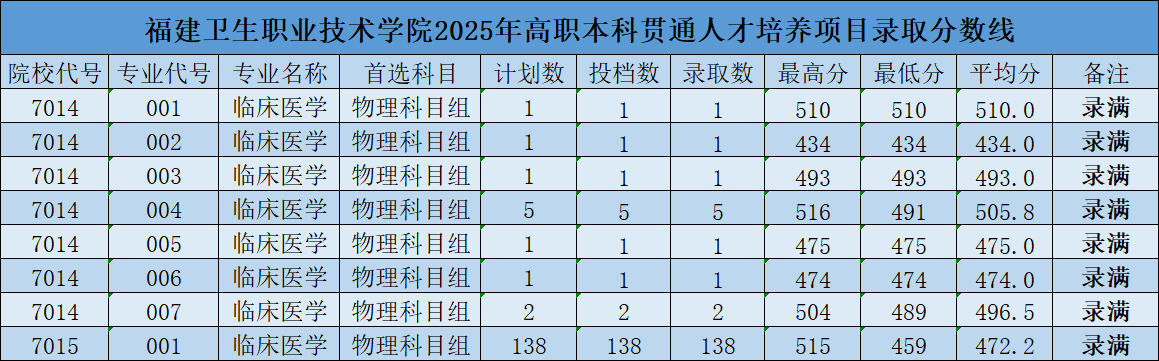 福建卫生职业技术学院2025年福建省普通高考录取分数线
