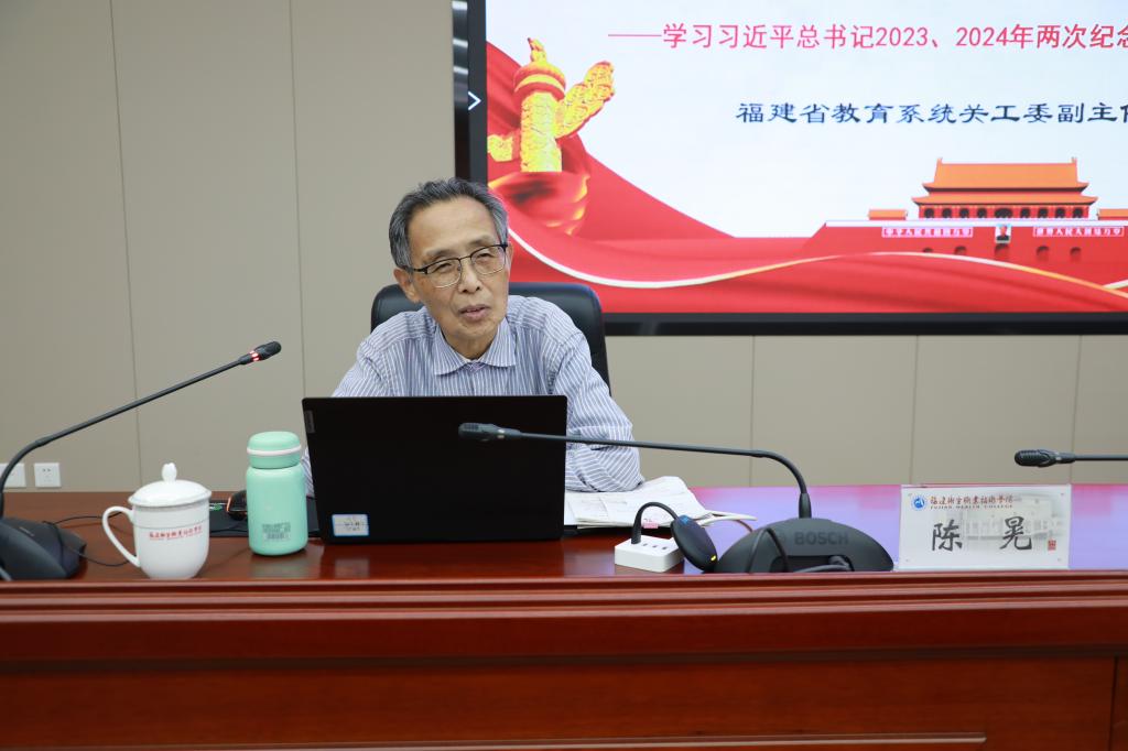 为深入学习贯彻习近平新时代中国特色社会主义思想,发扬红色传统,传承红色基因,引领师生继续坚定跟党走、建功新时代,10月22日,我校关工委邀请福建省教育系统关工委主任陈晃走进学校思政课堂,为校师生代表举办红色精神专题讲座,福建省教育系统关工委副秘书长、办公室主任罗永倩陪同。校关工委主任严肃、副主任陈雄出席讲座,校关工委、二级学院关工委、学生工作部党支部、团委负责人、辅导员代表和学生代表共100余人参加讲座,讲座由副校长、校关工委副主任黄铭珊主持。