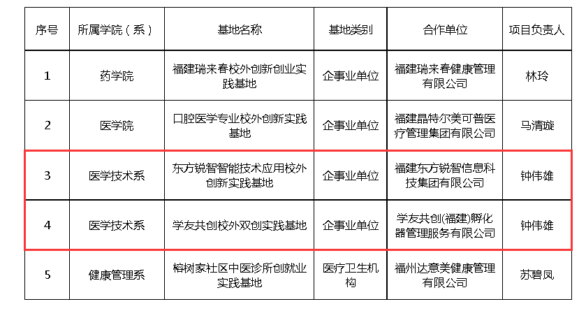 根据《福建卫生职业技术学院校外创新创业实践基地管理办法(试行)》(闽卫院教〔2023〕4 号),学校组织开展2023年度校外创新创业实践基地项目评选工作。经各学院(系)积极申报,教务处形式审查,专题会议讨论并表决通过,我系两个基地入选建设项目名单。