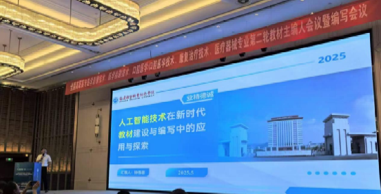 本次共派出13位教师参与到了10本教材的编写工作,其中钟伟雄、陈文山两位老师分别担任医疗器械类专业《电子技术应用》、《医用电子仪器》的主编工作;另有5位老师担任各自相关专业的副主编工作。钟伟雄老师受邀在会上以《人工智能技术在新时代教材建设与编写中的应用与探索》为题作专题报告,展示了AI在内容生成、个性化学习资源开发与质量评估中的最新实践。