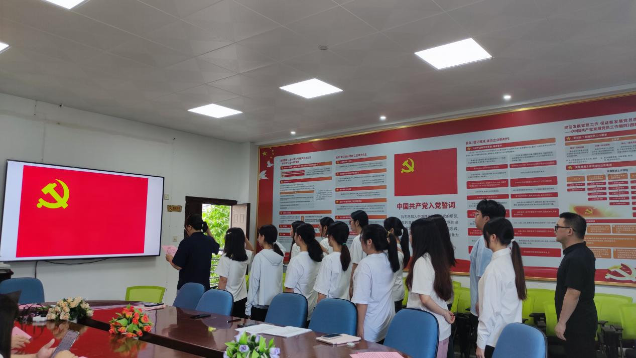 6月18日,医学技术与工程学院举行预备党员入党宣誓仪式。医学技术与工程学院党委书记柯琼莺、党委委员周微琳,学生党支部书记及14名新党员共同参加仪式。