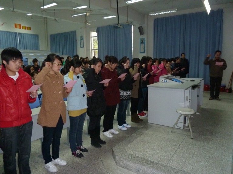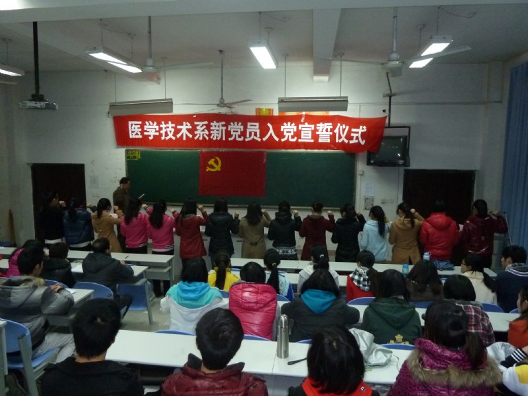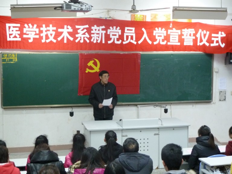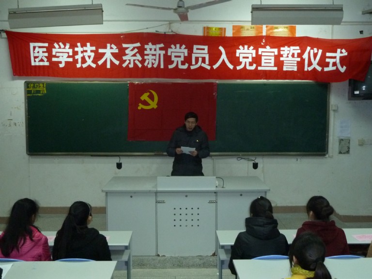 “我志愿加入中国共产党,拥护党的纲领,遵守党的章程,履行党员义务……”2012年3月13日下午,医学技术系15名新发展党员在系部第一阶梯教室面对鲜艳的党旗庄严宣誓。出席本次宣誓仪式的有系党总支委员、各支部委员、辅导员、预备党员,以及入党积极分子。宣誓仪式由系党总支副书记洪聿荣同志主持。 伴随着雄壮的《国际歌》,宣誓仪式拉开了帷幕。首先由系党总支组织委员林雪金老师代表党总支宣布参加宣誓的15名党员名单。随后,15名预备党员在党总支宣传委员连健老师的带领下,面对鲜红的党旗庄严宣誓。10检验301班巫金梅同学、10放疗301班戴艺涛同学分别代表参加宣誓的新党员和入党积极分子发言。 仪式上,系党总支委员郭礼坚副主任在会上首先代表系党总支向新党员同志表示衷心的祝贺。并指出,预备党员面向党旗进行入党宣誓,表现了入党的庄重性和严肃性,是对预备党员进行教育、增强党性观念的一种形式。宣誓是一种形式,更重要的是通过这种形式,用誓词激励党员,终生牢记自己的入党誓词,并付诸实践行动。最后,他向全体新党员和入党积极分子提出了4点要求:1、政治追求的起点要高。2、要把体现自身先进性的目标与自己的本职工作学习紧密地结合起来。3、加强理论学习。4、树立自身良好威信。 入党宣誓仪式在热烈、隆重、庄严的气氛中进行,感染了每一位与会同志,同时也是一堂很好的党课教育课,更是为医学技术系党总支开展“创先争优”活动写下了亮丽的一笔。
