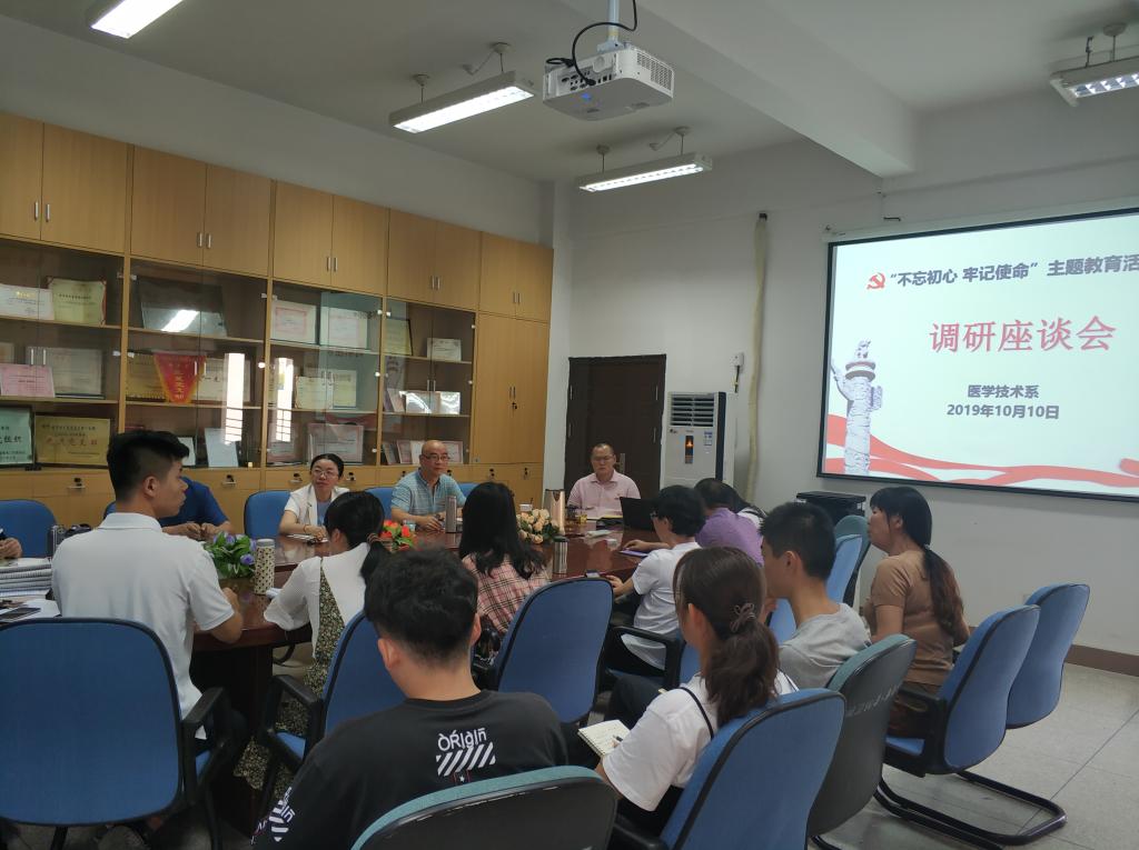 根据学院党委开展“不忘初心、牢记使命”主题教育的调研工作部署,10月10日下午,黄铭珊副院长来到医学技术系301会议室召开专题调研座谈会。会议由医学技术系党总支负责人邱滚忠同志主持,系部领导班子、教研室主任、实训中心主任、系部办公室工作人员、辅导员代表、学生代表等师生代表参加了调研座谈会。
