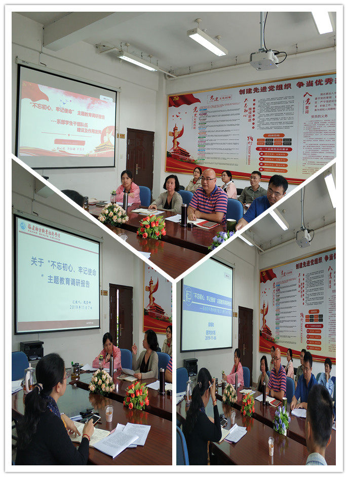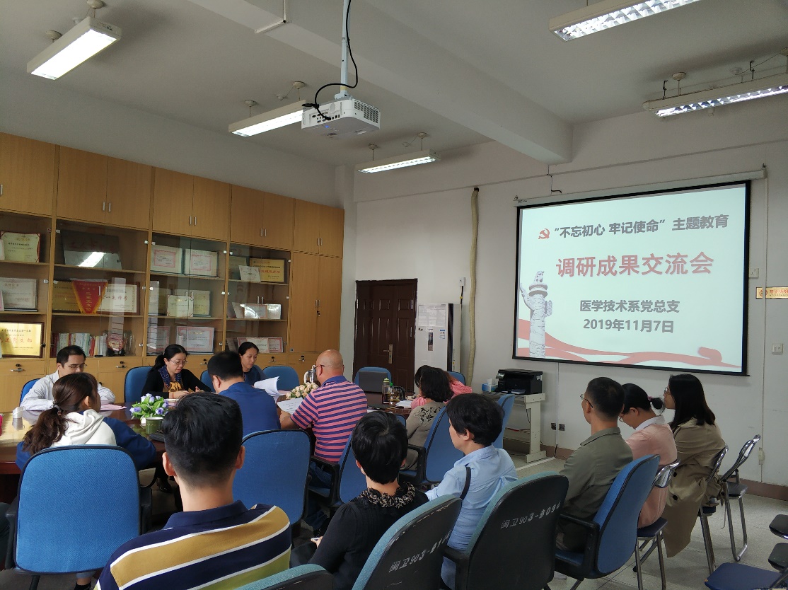 11月7日下午,医学技术系召开“不忘初心、牢记使命”主题教育系领导班子调研成果交流会,梳理前期调研情况,总结调研经验,进一步检视问题,推动问题解决。学院党委委员、副院长、巡回指导六小组组长黄铭珊同志及指导组成员现场听取了汇报。医学技术系领导班子、党务干部、教研室主任、实训中心主任、师生代表等共同参会。医学技术系党总支负责人邱滚忠同志主持本次交流。