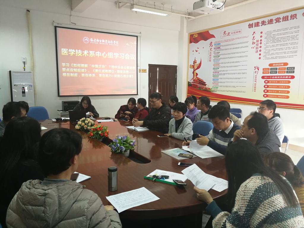2020年1月9日, 医学技术系在系部楼301召开中心组学习(扩大)会议,学习《如何理解“中国之治”?四中全会公报这些要点应知应读》、《黄红武教授以<国家治理——根在制度,贵在体系,重在能力>讲座心得分享》,会议由系党总支负责人邱滚忠同志主持。