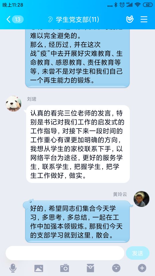 2月20日晚,在线学习的第四天,医学技术系第一、第二和学生党支部开展了一次特别的支部大会,围绕“停课不停学”开展学习和讨论,总结提升教学经验。党员老师学习了习近平总书记在中央政治局常委会会议研究应对新型冠状病毒肺炎疫情工作时的讲话,学习了《教育部应对新型冠状病毒肺炎疫情工作领导小组办公室关于在疫情防控期间有针对性地做好教师工作若干事项的通知》,认真领会防疫工作重要精神和工作部署,进一步增强党员教师对打赢这场战“疫”的信心。同时,结合学习强国APP文章《“停课不停学”,教师如何调整角色》,教师党支部着重从如何组织好在线教学开展了深入交流;学生党支部则侧重探讨如何引导学生有效开展线上学习。大家都认为本次全课程的线上教学是一次培养学生自主学习能力的好机会,有效的指引、多样的互动、及时的评价,可以达到较好的停课不停学效果。