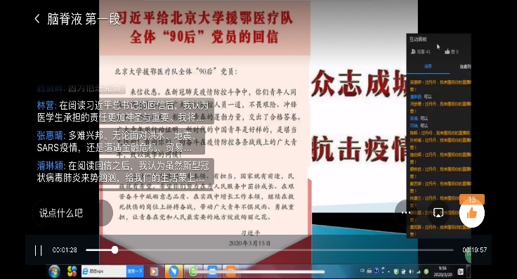 何旭春和过丹丹老师结合习近平总书记3月15日给北京大学援鄂医疗队全体“90后”党员回信,引导学生展开讨论,要以先进医务工作者为榜样,努力积攒本领,茁壮成长。青春之美,正是奋斗之美;青年之快乐,正是奉献之快乐。